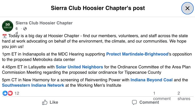Community organizers cite concerns with air pollution, rising electricity costs, and other environmental issues. The Sierra Club Hoosier Chapter said they were “advocating on behalf of the environment, the climate, and our communities.”
