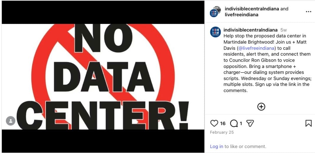 Social media posts reviewed by The Daily Wire show organizers encouraging residents to contact Gibson to opposed the data center. In one post, activists urged supporters to call residents and connect them with Gibson’s office to voice their concerns. The Indivisible Chapter for Central Indiana’s Facebook page urged allies to “bring a smartphone + charger,” adding, “Our dialing system provides scripts.” The group offered two days to join in for phone calls with “multiple slots” for people to sign up.