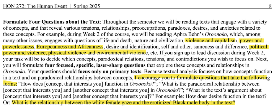 Another seminar session involved discussions of “violence and and capitalism, power and powerlessness, Europeanness and Africanness … political power and violence, physical violence and environmental violence,” according to documents obtained by the Goldwater Institute. Instructors asked students to “formulate questions” like, “What is the relationship between the white female gaze and the eroticized Black male body in the text?”