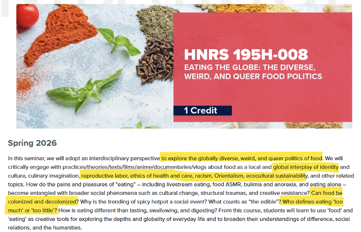 The University of Arizona’s Franke Honors College also requires students to participate in left-wing classes. One course, “Eating the Globe: The Diverse, Weird, and Queer Food Politics,” focuses on whether food can be “colonized and decolonized.” Another, “#Black Lives Matter Across the Americas,” examines “racial violence as in the case of police brutality (as targeted by Black Lives Matter activists in the U.S.)”