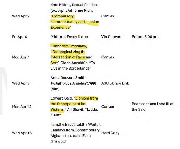 ASU’s Barrett Honors College requires that new students take a course called “The Human Event,” described on the university’s website as a “year-long, small, intensive, interdisciplinary, discussion-based seminar” that “forms the foundation of the first-year honors experience.” That website shows a “sample” reading list for the course composed entirely of classic works including those by Plato, Machiavelli, and Shakespeare. The Goldwater Institute, though, obtained the actual syllabus for “The Human Event” through a public records request. The list, which is not published online, includes books that claim the “patriarchy” controls society and that Israel enforces “militantly oppressive discriminations between Jews and non-Jews,” among other concepts.