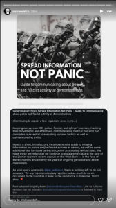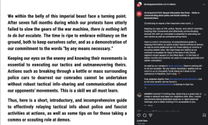 “Keeping our eyes on the enemy and knowing their movements is essential to executing our tactics and outmaneuvering theirs,” the post reads. “Actions such as breaking through a kettle or mass surrounding police cars to dearrest our comrades cannot be undertaken without robust tactical info-sharing and communication about our opponents’ movements.”