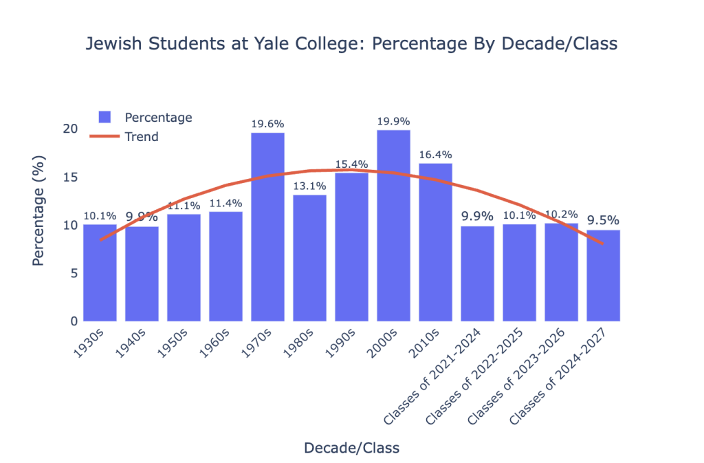 The 9.5 percent mark is the lowest in decades—even below the 9.9 percent of undergraduates who identified as Jewish in the 1940s, according to the survey, a time when the university imposed ruthless quotas on the number of Jews admitted. At that time, Yale intentionally rejected Jewish students in an attempt to address what university leaders described as the “Jewish problem,” according to Dan Oren’s history of anti-Semitism at Yale, Joining the Club: A History of Jews and Yale.