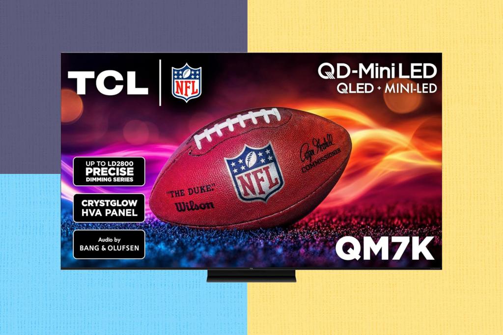 TCL QM7K Series TV with QD-Mini LED technology and a football on screen.