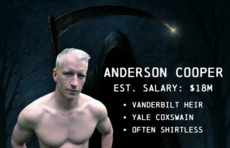 Anderson Cooper: The privileged scion who pioneered the iconic “tight black shirt in disaster zone” style of journalism now imitated by ABC’s David Muir could be gearing up for early retirement. Cooper left his $2 million side gig at 60 Minutes earlier this month because he wanted to spend more time with his shirt off getting sloppy drunk with Andy Cohen with his kids.