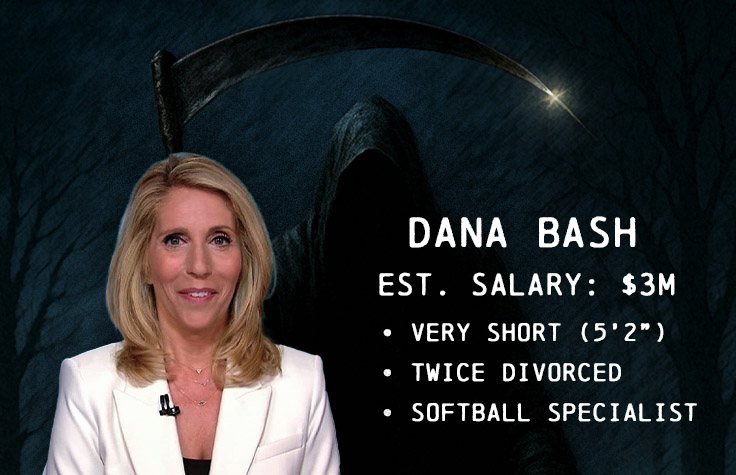 Dana Bash: There’s a reason Kamala Harris, who is (justifiably) terrified of speaking off-script, chose Bash to conduct the first sit-down interview of her failed campaign in 2024. Among other things, Bash has lamented the lack of multimillion-dollar contracts in the WNBA, a money-losing enterprise. She is the ex-wife of former Obama adviser Jeremy Bash, and is also the ex-wife of her CNN colleague John King.