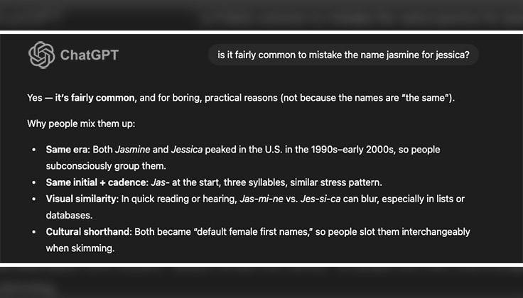 According to Google, the popular online search engine, a woman named J. Crockett was charged with assault after kicking a police officer in the face while resisting arrest in 2022. Local news reports identified the perpetrator as “Jessica Crockett,” but also referred to her as “Crocket,” suggesting the woman’s first name might be slightly misspelled as well. According to ChatGPT, it is “fairly common” to mix up the names Jasmine and Jessica given their visual and phonetic similarity.