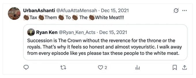 In this post, for example, someone posted his thoughts on the television show “Succession.” And Mamdani’s new equity director responds by saying, “Tax them to the white meat.” Yes, “tax them to the white meat.”