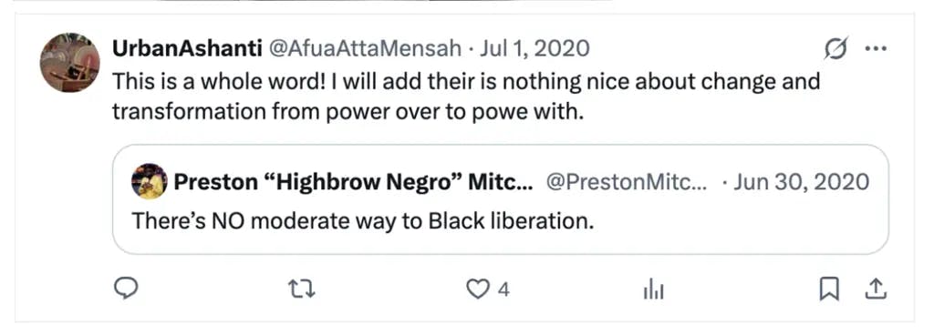 She also reposted and endorsed a message stating, “There’s NO moderate way to black liberation.”