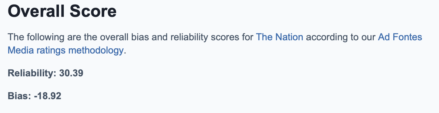 Ad Fontes considers Media Matters for America, a progressive activist group that describes itself as a media watchdog, more trustworthy than the Free Beacon as well. The website gives Media Matters a reliability score of 26.45. The Nation, though described as “hyper-partisan left,” has a reliability rating of 30.39.