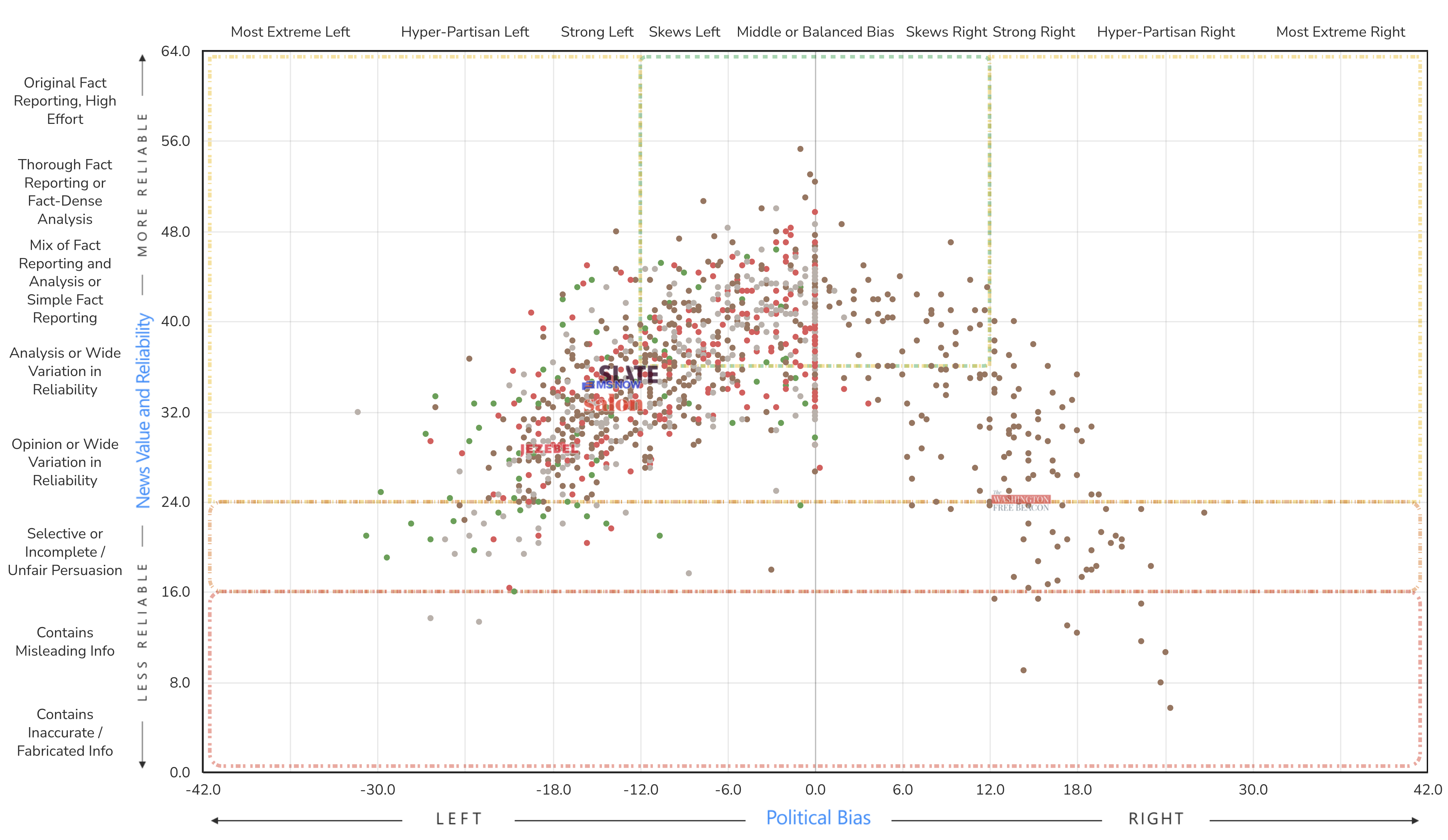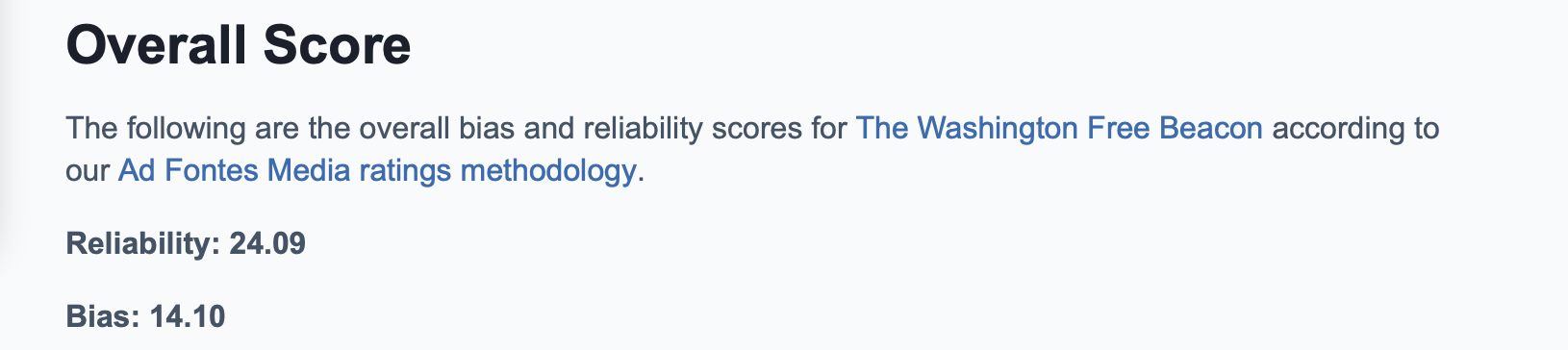 The Washington Free Beacon, for instance, has a reliability score of 24.09 and a bias score of 14.10.