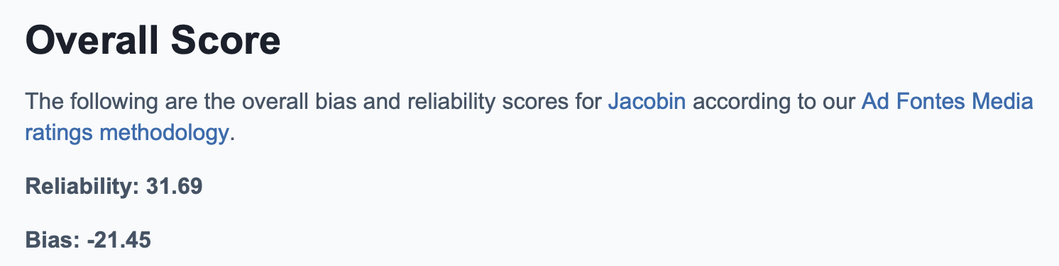 Socialist magazine Jacobin earns a 31.69 reliability rating from Ad Fontes, placing it higher on the scale than the Free Beacon, National Review, the New York Post, and the Daily Wire.