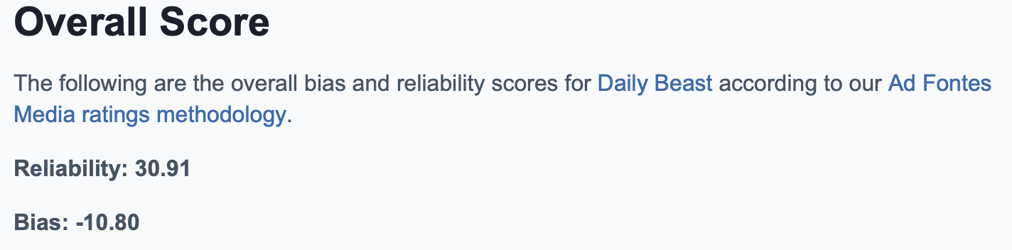 The Daily Beast, according to Ad Fontes, is both more reliable and less biased than the Free Beacon, with a reliability score of 30.91 and a bias score of -10.80.