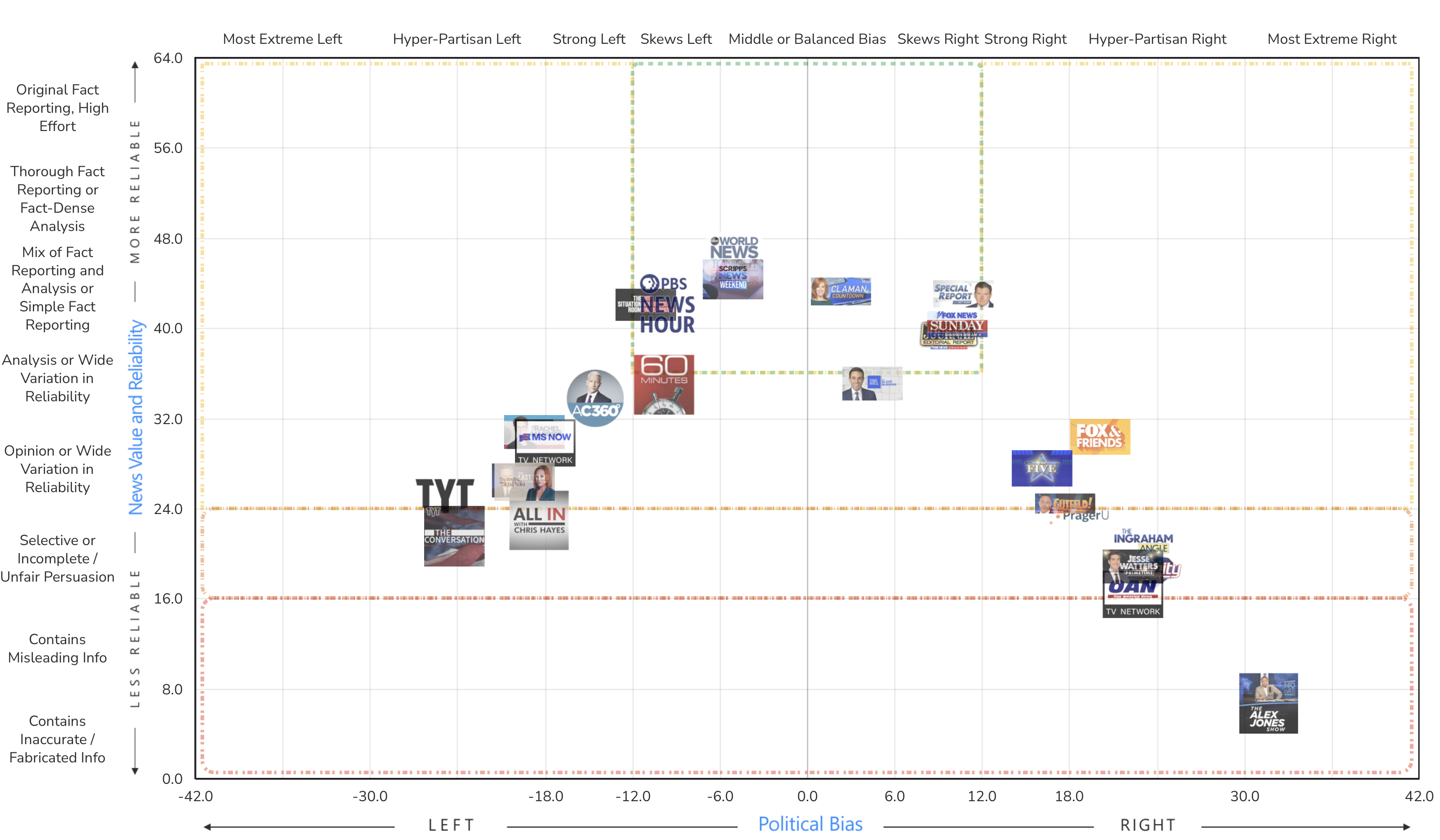 The revelation comes amid questions about Ad Fontes’s reliability. The group publishes a “Media Bias Chart” that categorizes U.S. news outlets by political leanings and trustworthiness using two axes: one for ideological bias that runs from -42 on the left to +42 on the right and another for reliability that goes from 0 to 64.