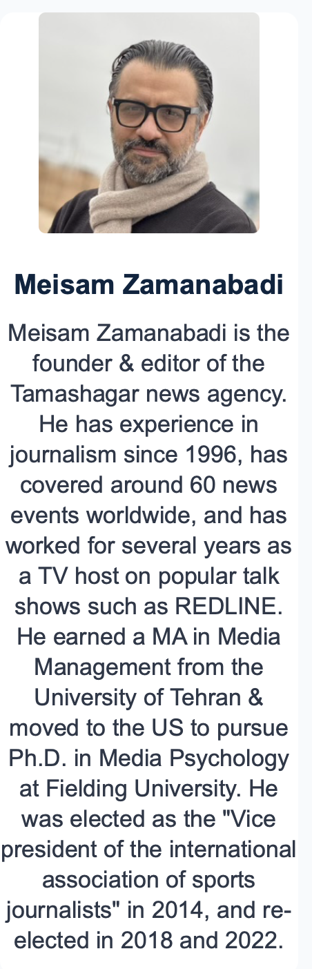 Zamanabadi has maintained ties to Iranian government media while living in the United States. He has appeared as a commentator on Iranian state TV multiple times since 2024, according to his Instagram. Last summer, he also successfully lobbied the Asian International Sports Press Association to pass a “resolution condemning the Israeli regime’s military aggression on Iranian soil” during the 12-day war. Zamanabadi serves as vice president of the Asian International Sports Press Association, according to its website.