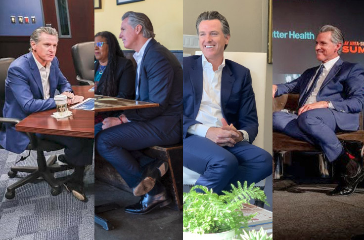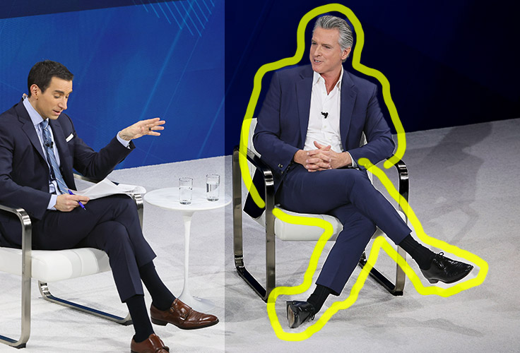 There’s something wrong with Gavin Newsom. Americans recoiled in horror, then squinted in fascination at the images of Newsom’s appearance at the New York Times Dealbook Summit. There he was, the greaseball California governor, sitting in a chair with his legs crossed impossibly tight, protruding akimbo at improbable angles like a human swastika, a wanton display of “testicle-crushing” contortion. It was the opposite of manspreading, the inverse of kink-splaying, yet Newsom’s gnarled pose, his tangled appendages—like a steel-beamed hedgehog standing guard at Omaha Beach—still managed to intrude upon the public space in a way that many found unsettling.