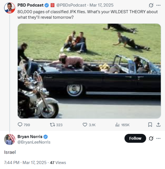 Around the same time, Norris in another since-deleted post responded to a request for users’ “WILDEST THEORY” about what the “classified JFK files” would reveal by writing, “Israel.”