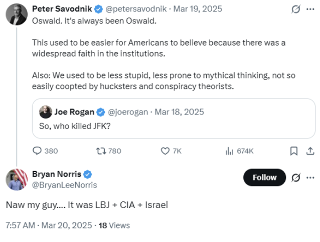 Norris, an Army veteran who says he manages “complex initiatives for a Fortune 500 company,” has also spread conspiracy theories about the United States and Israel. In a since-deleted March 2025 X post responding to Peter Savodnik of the Free Press, who identified Lee Harvey Oswald as responsible for the assassination of President John F. Kennedy, Norris wrote, “Naw my guy…. It was LBJ + CIA + Israel.”