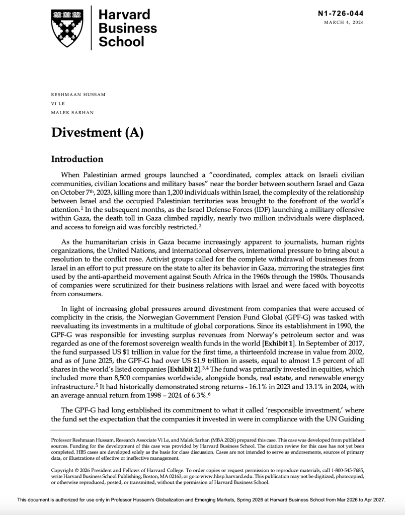 Harvard “case study” pedagogy sometimes features a two-part presentation in which students get part of the story, discuss what they’d do, and then get the second part of the case reporting what the decisionmakers actually did and how the decision turned out. The case version that was obtained by the Free Beacon is titled Divestment (A), suggesting that a part (B) may be next. The case carries a boilerplate disclaimer that cases “are developed solely as the basis of class discussion” and “not intended to serve as endorsements, sources of primary data, or illustrations of effective or ineffective management.” The fine print also says “Funding for the development of this case was provided by Harvard Business School. The citation review for this case has not yet been completed.” A Free Beacon article last month about the Norwegian fund’s divestment from Bezeq, an Israeli telecommunications firm, reported that at that point, it was “up more than 50 percent in the 14 months since the Norwegians decided to sell.” That story also addressed Caterpillar: “On Aug. 25, 2025, the Norges Bank Executive Board decided to dump its $2.1 billion worth of shares in Caterpillar Inc., the Texas-based construction giant. The ethics board reportedly declared that ‘bulldozers manufactured by Caterpillar are being used by Israeli authorities in the widespread unlawful destruction of Palestinian property.’ Caterpillar stock closed at $702.89 a share on Feb. 3, 2026, up from its $432.30 close on the day of the divestment announcement, according to Yahoo Finance. That’s a 62.6-percent gain, handily outperforming the 8.3-percent return of the S&P 500 index.”