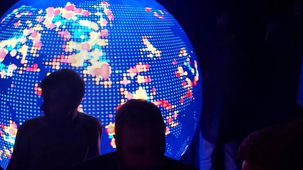 When doors finally opened after several delays, guests entered a dimly lit space wrapped in blackout curtains, lit primarily by a glowing LED sphere in the center of the room dubbed “The Globe.” It looped imagery of Earth, Polymarket branding, and even a digital Magic 8 Ball message: “The future belongs to those who can see it.”