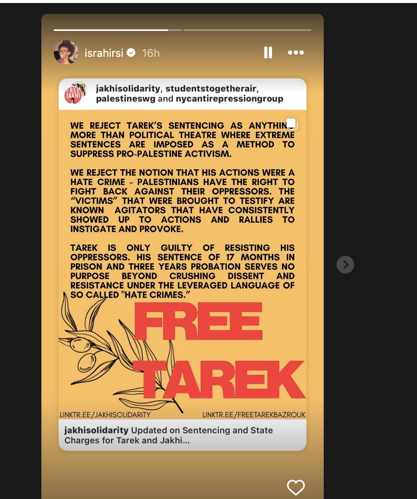 “We reject Tarek’s sentencing as anything more than political theatre where extreme sentences are imposed as a method to suppress pro-Palestine activism,” the post Hirsi shared reads. “We reject the notion that his actions were a hate crime—Palestinians have the right to fight back against their oppressors … Tarek is only guilty of resisting his oppressors. His sentence of 17 months in prison and three years probation serves no purpose beyond crushing dissent and resistance under the leveraged language of so-called ‘hate crimes.'”