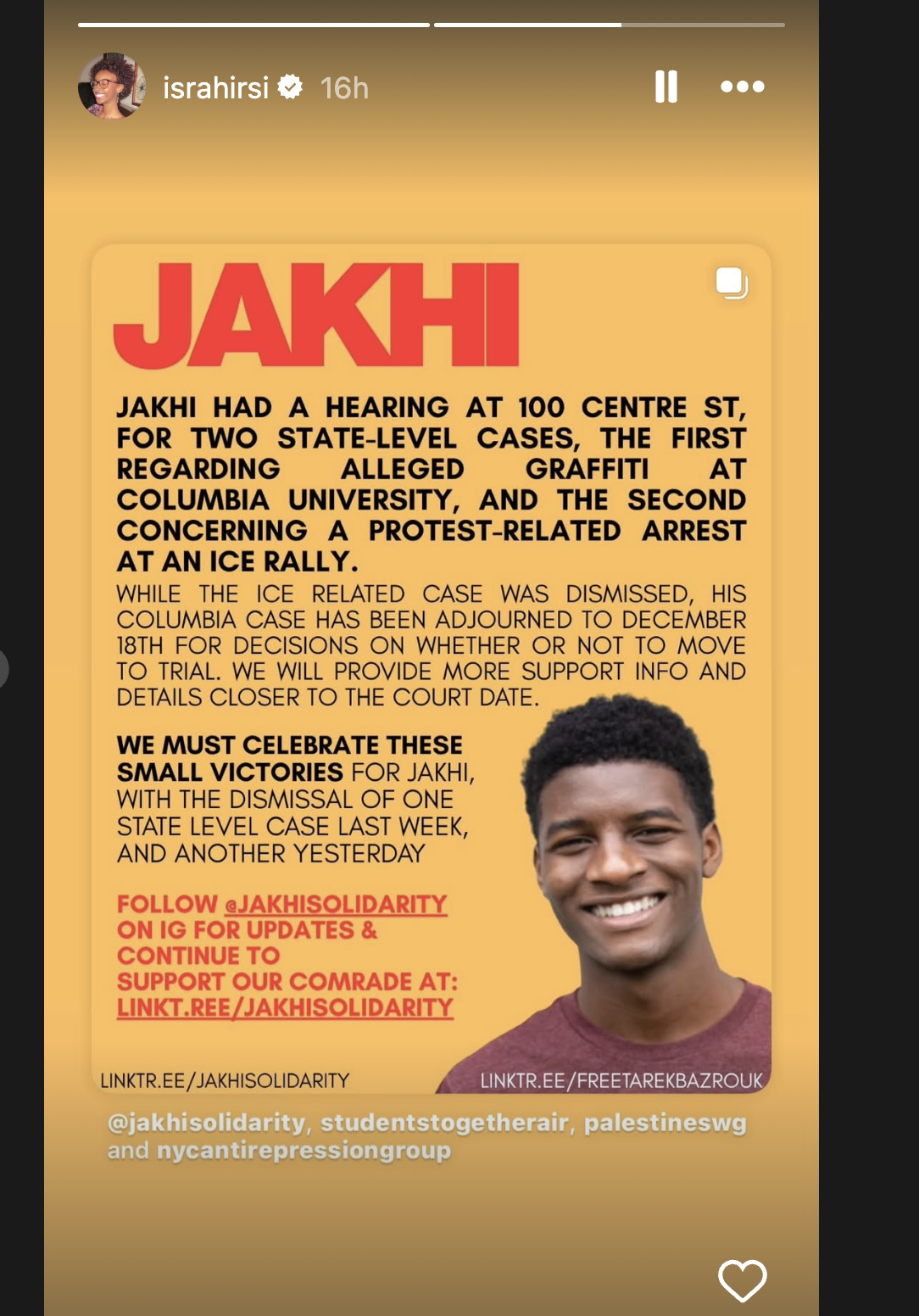 “Jakhi had a hearing at 100 Centre St, for two state-level cases, the first regarding alleged graffiti at Columbia University, and the second concerning a protest-related arrest at an ICE rally,” the post reads. “While the ICE related case was dismissed, his Columbia case has been adjourned to December 18th for decisions on whether or not to move to trial.”