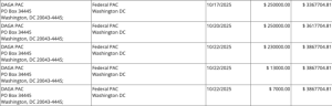 The DAGA also provided a separate $250,000 donation to Jones on Oct. 22, bringing its total contributions to $750,000 since texts surfaced showing Jones fantasizing about putting “two bullets to the head” of a GOP lawmaker and wishing for the death of that lawmaker’s children.