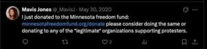 “I just donated to the Minnesota freedom fund,” Mavis Jones posted to X in May 2020, as Black Lives Matter rioters wreaked havoc in Minneapolis in the days following George Floyd’s death, and just months before marrying Jay Jones. She also linked to the group’s donation page before adding, “please consider doing the same or donating to any of the *legitimate* organizations supporting protesters.”