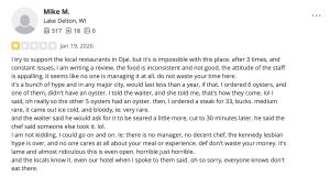 “I ordered 6 oysters, and one of them, didn’t have an oyster,” that reviewer noted. “I told the waiter, and she told me, that’s how they come.”