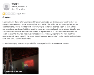 “For a relatively expensive (for how much you received) steak it was arguably the worst steak I have ever eaten,” wrote one annoyed Yelp reviewer, who also noted an added “3% extra on your bill for ‘employee health’ whatever that means!”