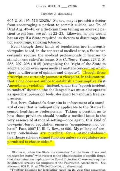 In other words, she’s saying that, even though the Colorado government is explicitly banning speech by outlawing so-called “conversion therapy,” nevertheless, Colorado isn’t actually “suppressing speech.” That’s because, according to Ketanji Brown Jackson, the government is only banning speech in the context of some other “conduct” — the talk therapy session. So really, as Jackson understands the situation, the government of Colorado is really banning “conduct,” not “speech.” She thinks the ban on speech is incidental to the ban on conducting therapy sessions in a certain way.
