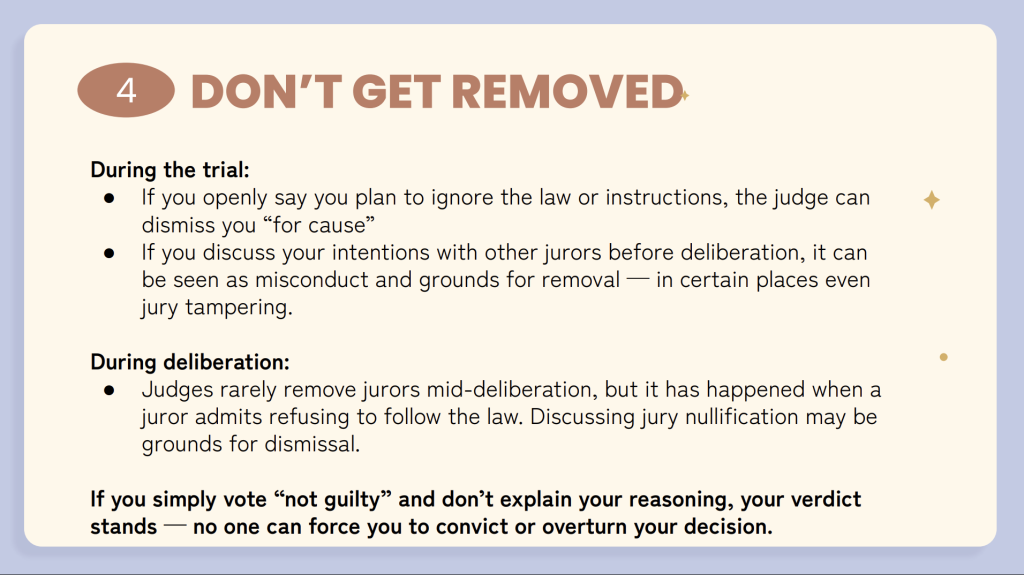 “You can legally nullify once on a jury, but if you say that’s your plan, you’ll likely be removed before the trial begins,” Freedom Trainers states on a training slide deck. “You always have the option of finding the defendant ‘Not Guilty.’ Even if you believe the law was broken. Even if the judge says you must convict,” the slide deck adds.
