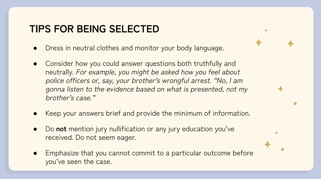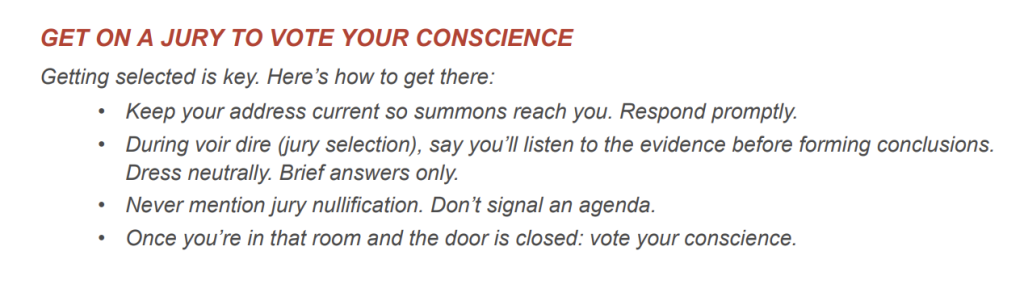 The group emphasizes, for example, that activists should dress neutrally, give brief answers, and say they will listen to the evidence before forming conclusions during jury selection. They should also never mention jury nullification before or during selection.