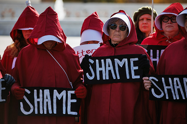 A handful of protesters, including a group of stone-faced women dressed as handmaids from The Handmaid’s Tale, gathered outside the Court on Friday as the Court met to consider Davis’s petition. A trans-pride flag was spotted next to an upside-down American flag, the latter of which has been widely condemned by liberal commentators as a “jaw-dropping” and “disgusting” assault on our cherished democracy.