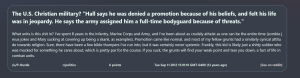 In the post, Platner responded to a 2008 lawsuit that claimed a soldier was denied a promotion for not embracing “fundamentalist Christianity.” Platner asked, “What units is this shit in?” and stated that while “I’ve spent 8 years in the infantry … I’ve been about as crudely atheist as one can be the entire time.” Platner cited “zombie jesus jokes and Mary sucking at covering up being a skank” as examples of what he found humorous during his years in the military.