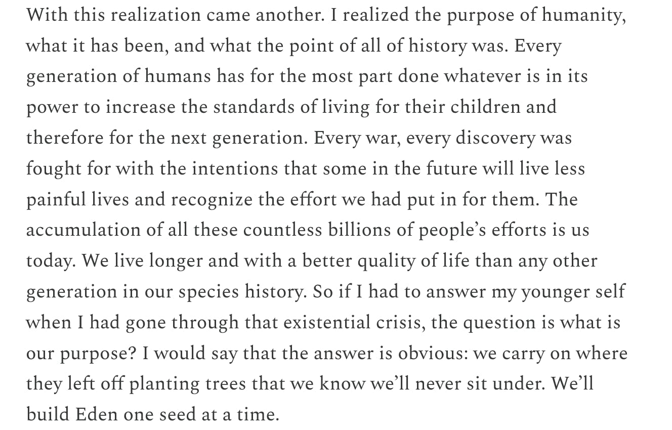 In one article, he reflects on the meaning of life, writing, “Every generation of humans has for the most part done whatever is in its power to increase the standards of living for their children and therefore the next generation.”
