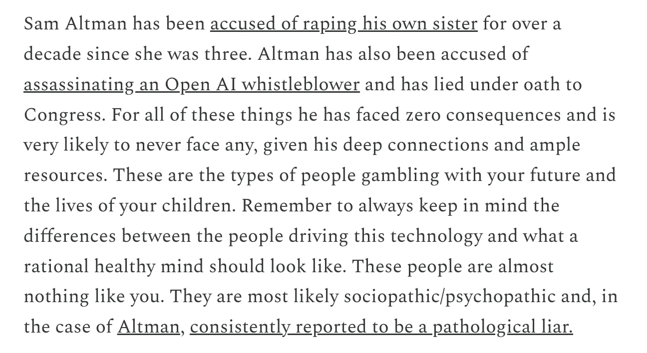 The post focuses heavily on Altman, repeating a series of unsubstantiated allegations, including claims that Altman “raped his own sister,” “assassinated an OpenAI whistleblower,” and lied “under oath to Congress.” Altman has denied the allegations involving his family, and his relatives have said his sister struggles with mental health issues. The whistleblower referenced, Suchir Balaji, was determined by the San Francisco Chief Medical Examiner to have died by suicide.