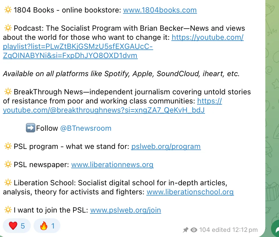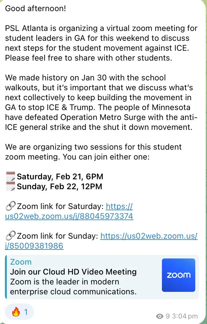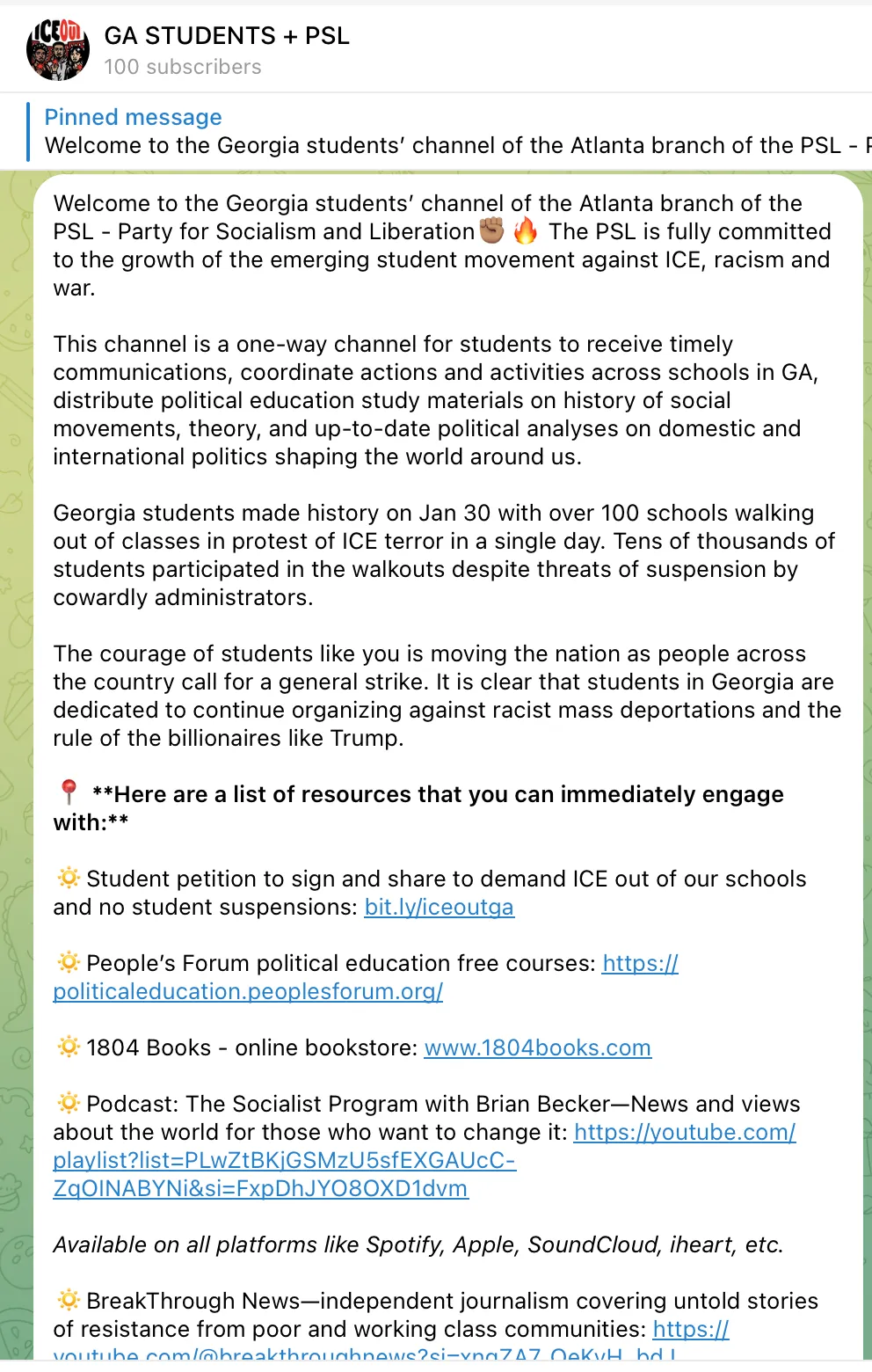 The Party for Socialism and Liberation (PSL), a Marxist-Leninist group that seeks to overthrow capitalism, has been a key player in the anti-Israel movement that gained steam in the United States after Hamas’s Oct. 7, 2023, attack. The PSL has recently pivoted to teaching high-schoolers to walk out of their classes in protest against ICE, creating a Telegram channel for students in Georgia and holding online webinars to direct a “student movement against ICE.”