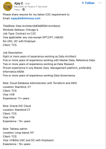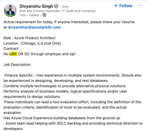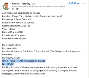 One recruiter posted on LinkedIn that an IT job in Chicago was open to almost “any visa” but “no USC,” meaning U.S. citizens.