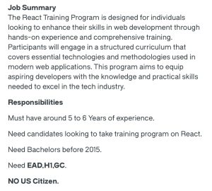 One MBE, Empower Professionals, has posted multiple advertisements since 2024 that appear to explicitly exclude American citizens. Another, Tekgence, posted an ad for a Java developer that said “No USC.”
