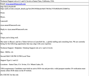 The $60-per-hour role would be based in Santa Clara, Calif., focus on “technical support,” and entail a 3–10 p.m. shift. Posted on Nvoids, an IT jobs aggregator, the ad described LanceSoft as an equal opportunity employer and said that the firm, one of the largest staffing agencies in the country, strives “to be as diverse as the clients and employees we partner with.”