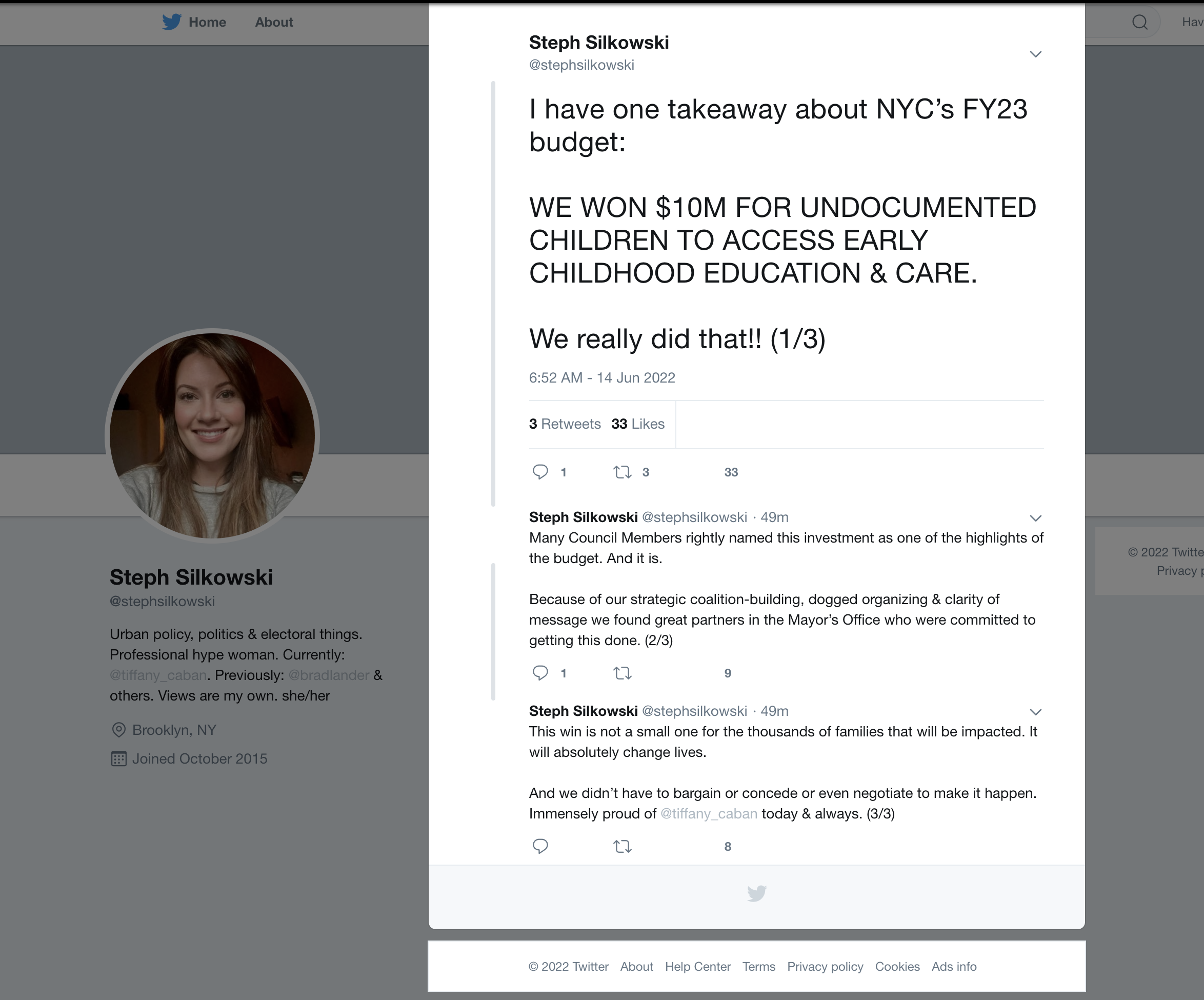 “WE WON $10M FOR UNDOCUMENTED CHILDREN TO ACCESS EARLY CHILDHOOD EDUCATION & CARE,” Silkowski blasted in an all-caps post from June 2022.