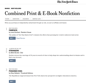 Stefanik’s book indicates that the video of her questioning has been viewed more than a billion times, making it “the most-watched congressional hearing in history.” That does not appear to impress the Times, which has not reviewed the book or mentioned it in any coverage beyond the Best Sellers list. The paper reviewed Dunham’s Famesick—favorably, with praise for its “quick hits of wit”—as well as an interview in the paper and an essay in the New York Times Magazine.