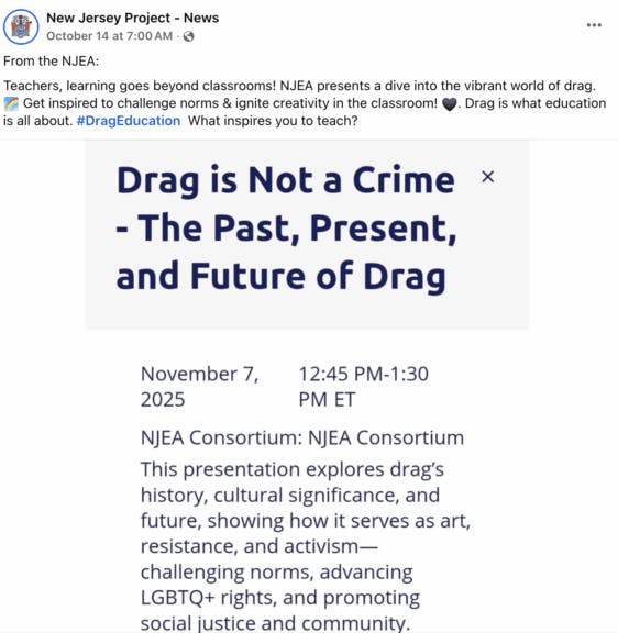 The New Jersey Project promoted the event with a post emphasizing the need to “ignite creativity in the classroom” and how “drag is what education is all about.”