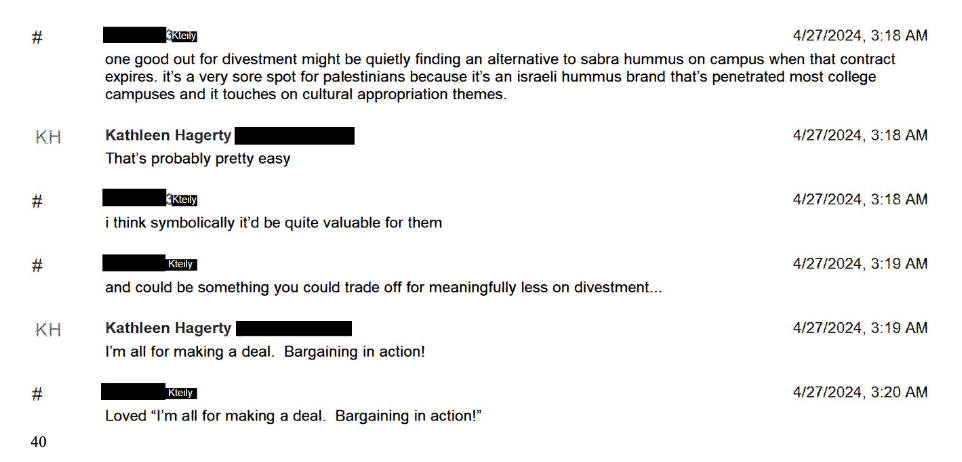 As he worked to resolve the standoff between the student activists and university administrators, Kteily suggested mollifying the protesters by “quietly finding an alternative to sabra hummus,” an Israeli hummus served on many college campuses. “Symbolically it’d be quite valuable for [the activists],” he wrote to Northwestern provost Kathleen Hagerty.