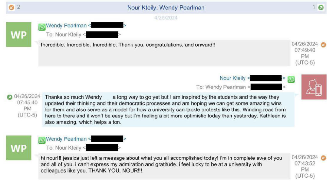 Kteily, who took on the role of liaison between administrators and rogue students during the encampment, said in a text message he was “inspired by the students” and hoped he could “get some amazing wins for them,” according to text messages obtained by the House Committee on Education and Workforce.