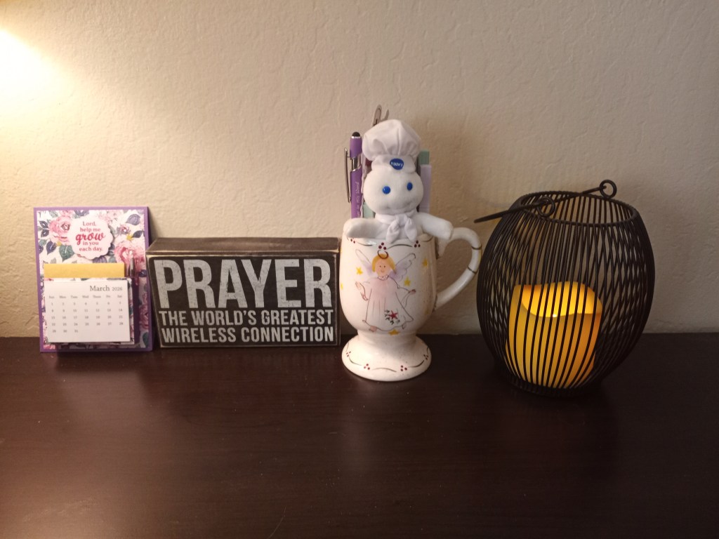 I bought the prayer sign as daily reminder to pray. Yes I have a little Pillsbury Dough Boy. One of my daughters gave him to me a few years ago in my stocking so he keeps me company when I’m at my desk.😀