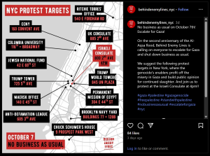 The caption for the group’s Instagram post with the flyer refers to Oct. 7 as “the Al-Aqsa flood,” Hamas’s name for the massacre. Behind Enemy Lines has also been coordinating additional Oct. 7 protests across the country, including in Chicago and Portland.