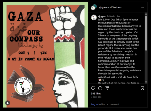 George Mason’s SJP chapter is planning a week of action to “BREAK THE BUTCHERS.” The group notes that “October 7th marks two years since the beginning of Israel’s devastating genocide on Gaza” with no mention of Hamas’s massacre.