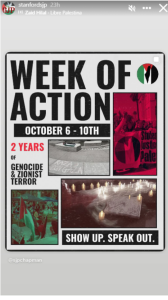 Stanford’s SJP chapter is also planning a “WEEK OF ACTION” in response to “2 YEARS OF GENOCIDE & ZIONIST TERROR.” It’s unclear where any events will be held or what they entail.